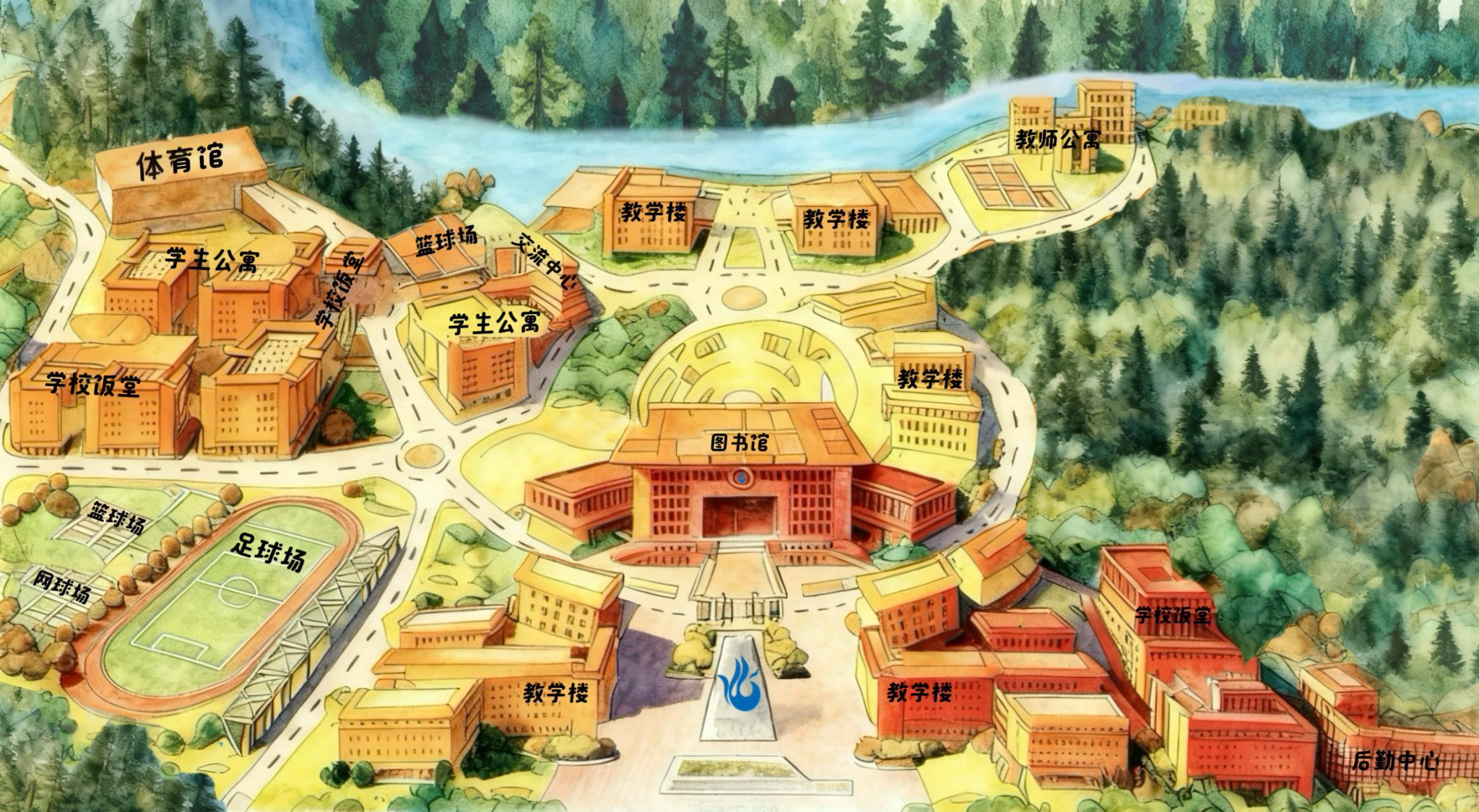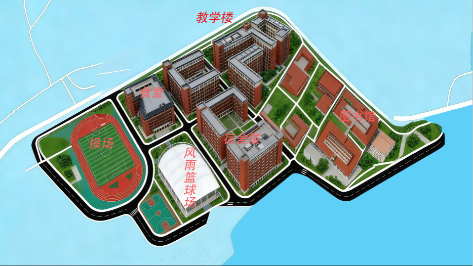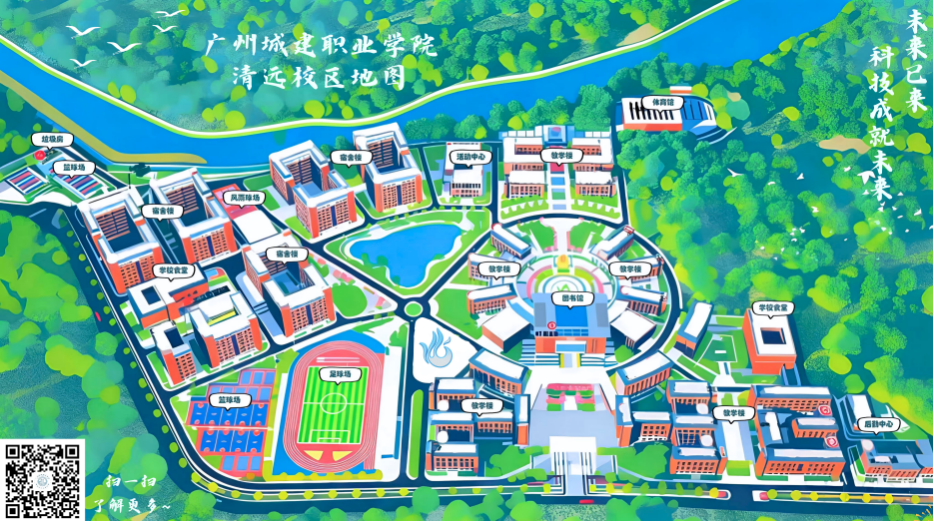 本作品williamhill官网(清远校区)的地图,是山水与人文织就的答卷—— 以图书馆为心,教学楼如星子环伺,是把 “求知” 锚在校园的魂魄里;西侧山脚偎着公寓与饭堂,是让烟火气枕着山岚;南侧岸畔铺展球场与体育馆,是把青春的跃动嵌进湖光。