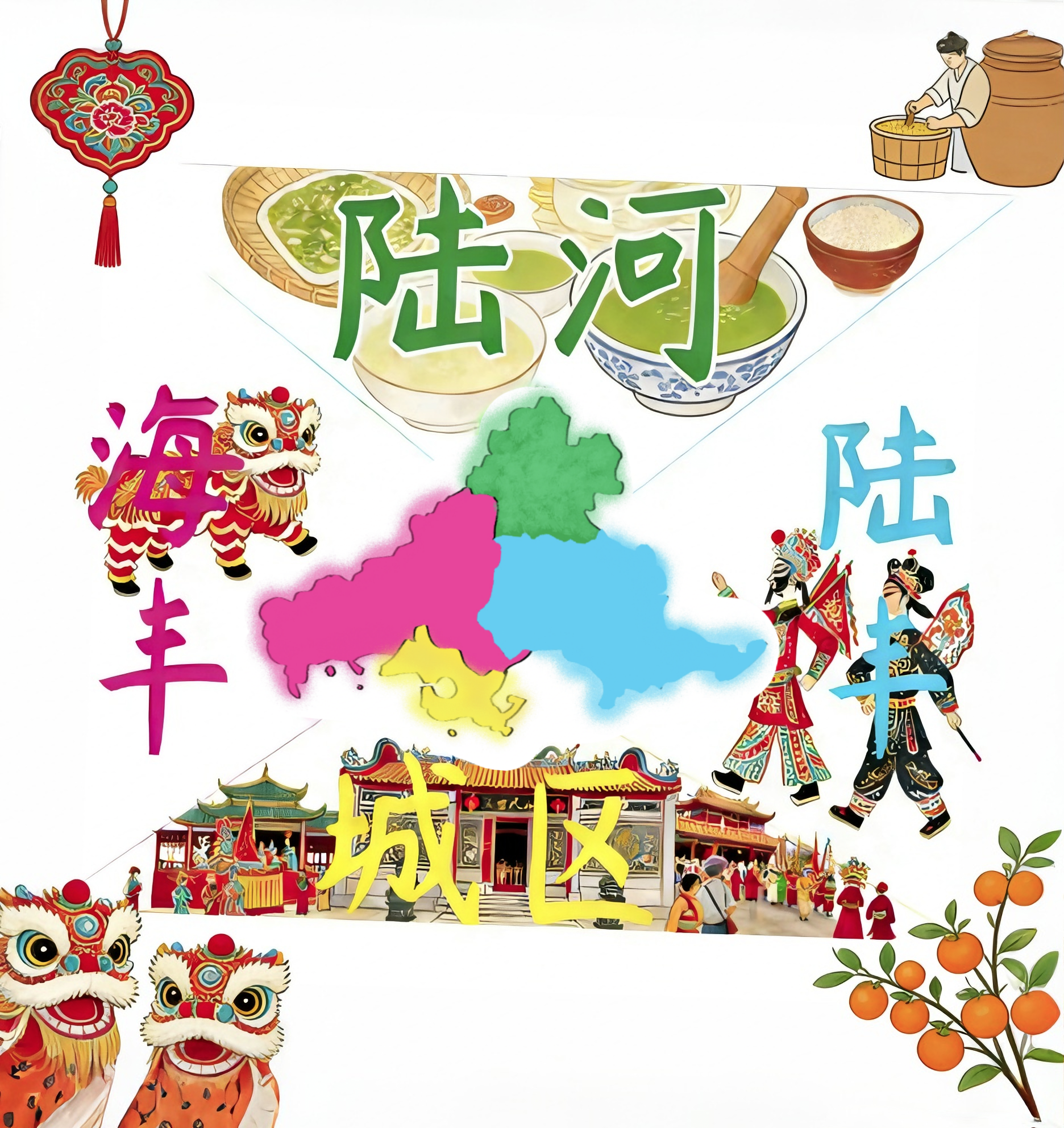 本作品以“从地理到文化”为核心设计思路,通过四幅递进式画面,将汕尾行政分区的地理基底,逐步转化为融合客家、红色、海洋、非遗的文化图谱。用具象的民俗符号与地域色彩,打破传统地图的抽象性,让汕尾的文化特质可视化、生动化,展现其“山海交融、多元共生”的地域文化底蕴。