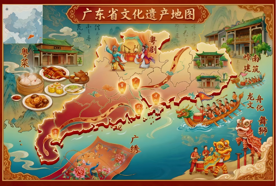 本作品以“岭南文脉·活态传承”为主题,通过地图可视化与插画艺术相结合的方式,系统呈现广东省具有代表性的文化遗产与地域文化符号。作品立足于广东独特的地理区位与历史文化背景,旨在将文化遗产从静态的“名录式展示”转化为“空间化、视觉化、故事化”的地图表达。