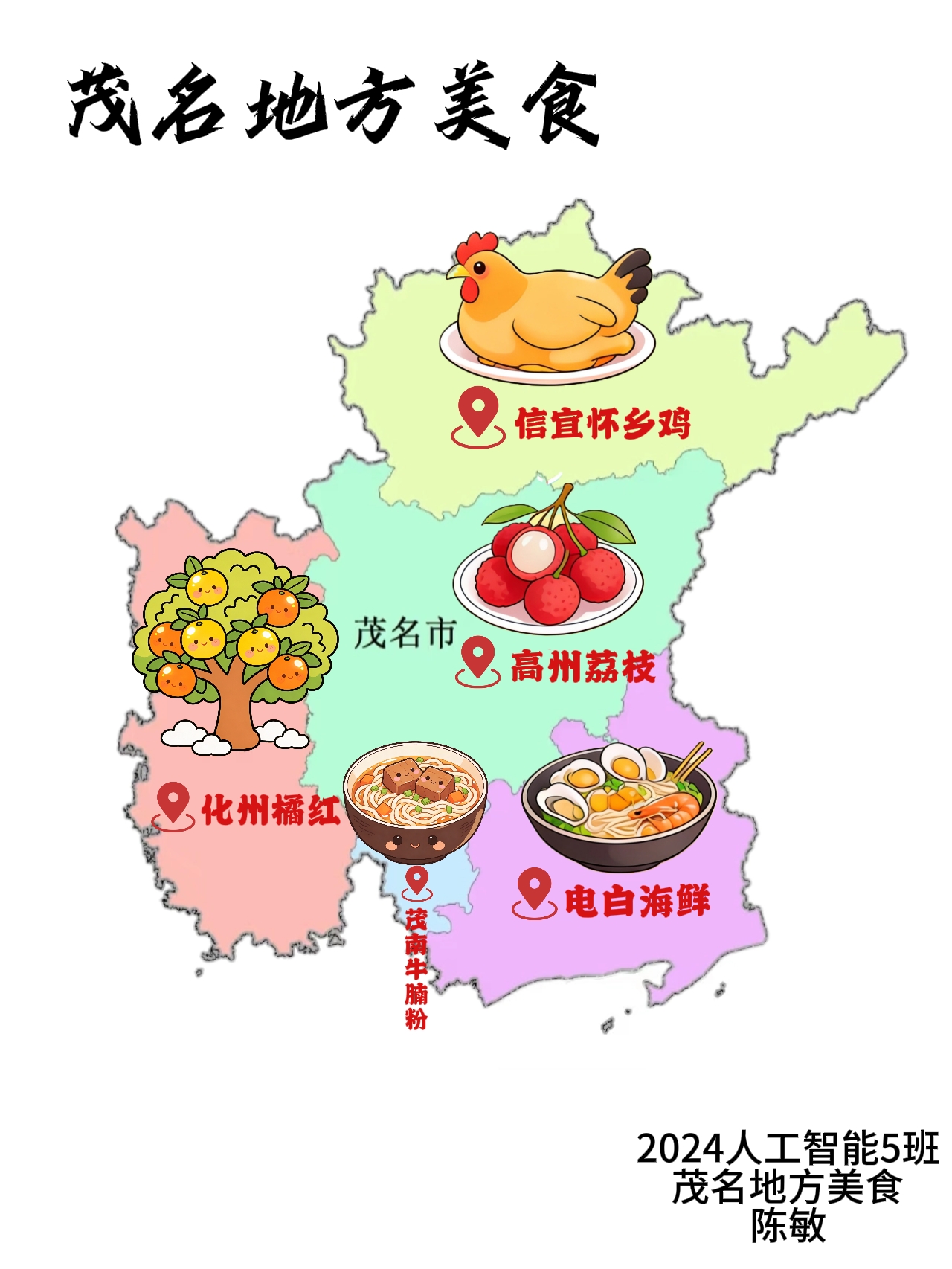 本作品以卡通插画形式将茂名各区县的代表性美食与行政区划地图融合,色彩明快、造型软萌,充满童趣与地域特色。整体设计将地理空间与美食文化结合,用Q版的艺术手法简化地域美食的视觉表达,既清晰标注了各区县的美食符号,又通过可爱的画风让茂名饮食文化更具亲和力。