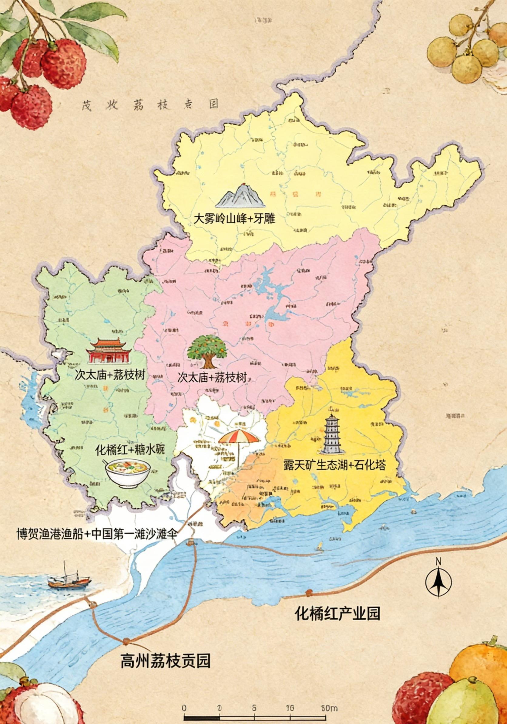 本作品茂名市政区创意地图,是 ArcMap 精准坐标与手绘笔触的巧妙融合,既锚定信宜、高州、化州、电白、茂南等行政区的准确边界,更以 “地理 + 人文” 的创意,挖掘出城市深藏的烟火气与文化根脉。