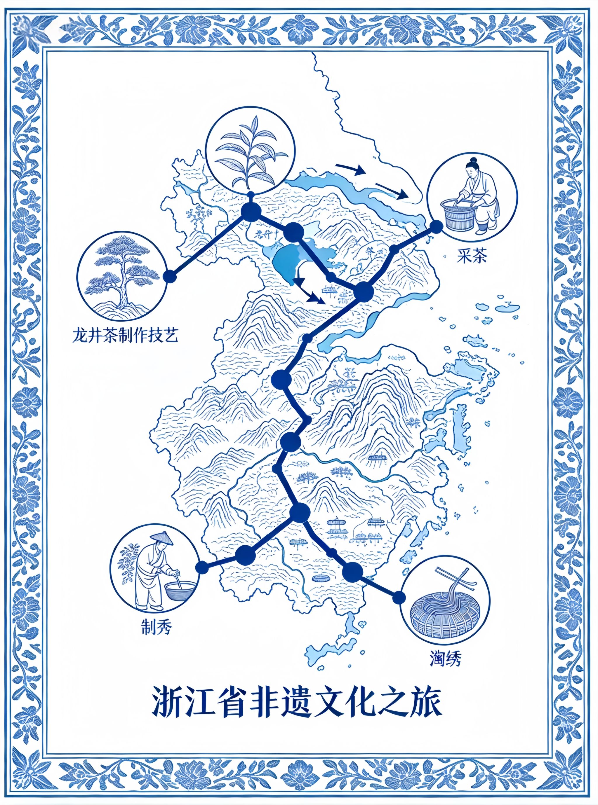 本作品以 “用地理空间技术,让非遗从‘名录’变为可触摸的生活旅程” 为核心理念:依托 ArcMap地理信息工具,将浙江非遗项目锚定在真实地域空间中,打破非遗 “静态展示” 的局限;以 “活态体验” 为线索,通过路线串联、属性联动,让非遗从 “技艺名词” 转化为 “可导航、可参与” 的旅行场景,实现技术实用价值与文化传播价值的统一。
