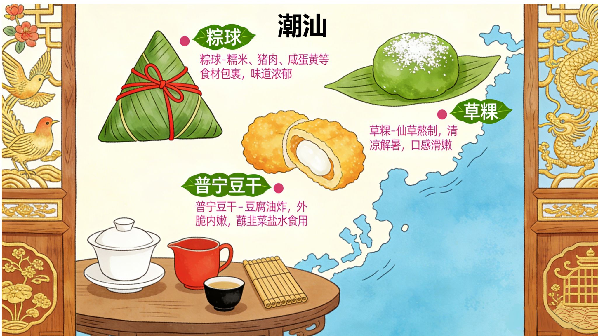 本作品以 “‘小食载文化’的地域生活美学” 为核心逻辑,既拒绝单纯的美食罗列,也不做刻板的文化符号堆砌 —— 而是通过 “美食+日常场景” 的融合,让潮汕饮食文化落地为可感知的生活片段。在视觉表达上,特意保留插画的“手绘温度”:粽球粽叶的纤维纹理、草粿表面的糖霜颗粒、普宁豆干油炸后的气孔质感,都以细腻笔触还原食材本味;同时植入潮汕传统美学元素 —— 左侧窗棂的金漆花鸟纹样、右侧屏风的龙纹浮雕,既是装饰,也是潮汕 “食俗与民俗共生” 的隐性表达,让美食成为地域文化的微观载体。