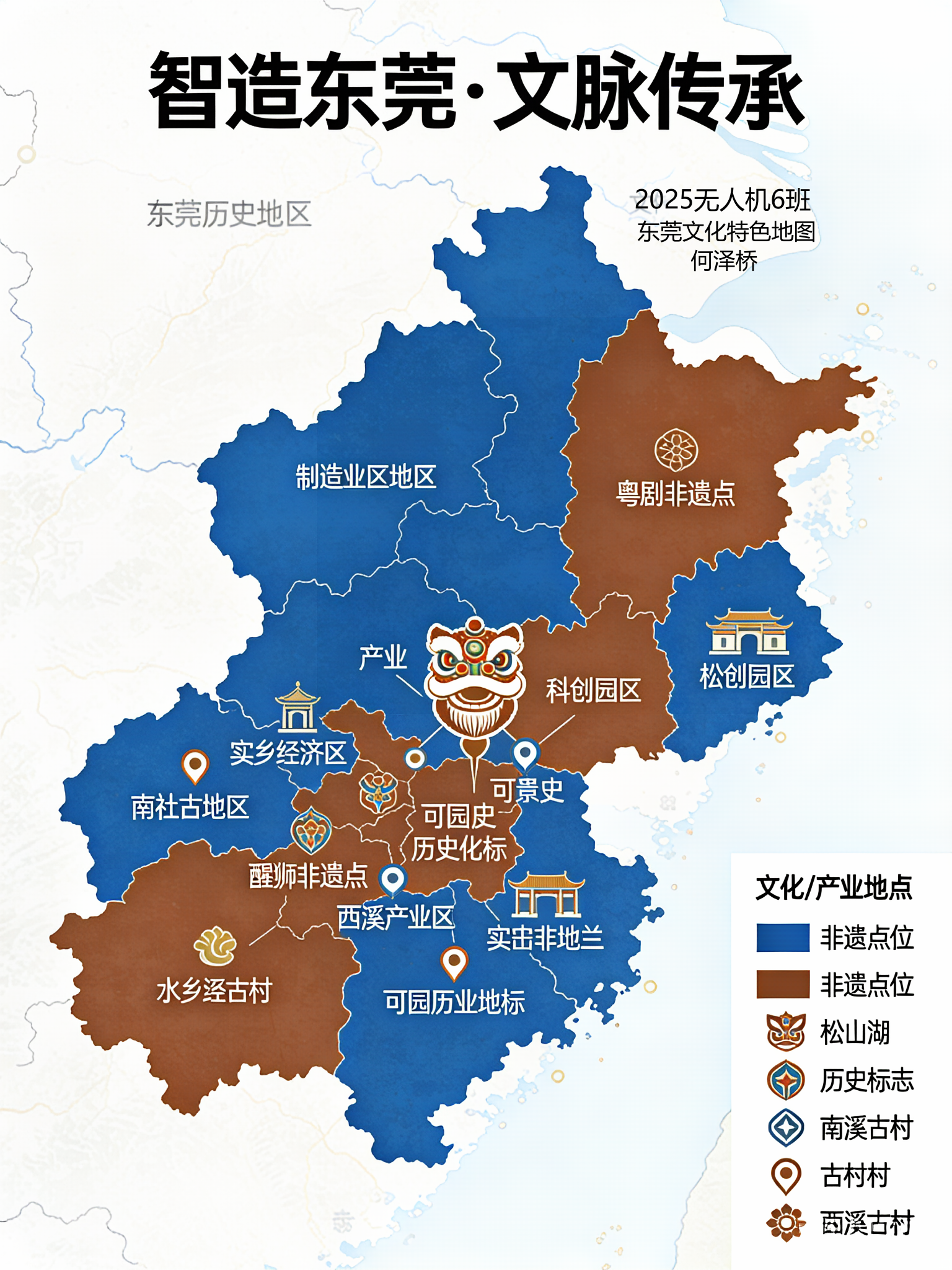 本作品紧扣东莞“制造业名城+岭南文化重镇”的双重特质,以“智造东莞·文脉传承”为核心主题,通过基础的空间规划与地图可视化方法,呈现城市发展脉络与文化底蕴,践行“以赛促学”目标,提升大一员工在数据整理、地图绘制方面的基础能力。