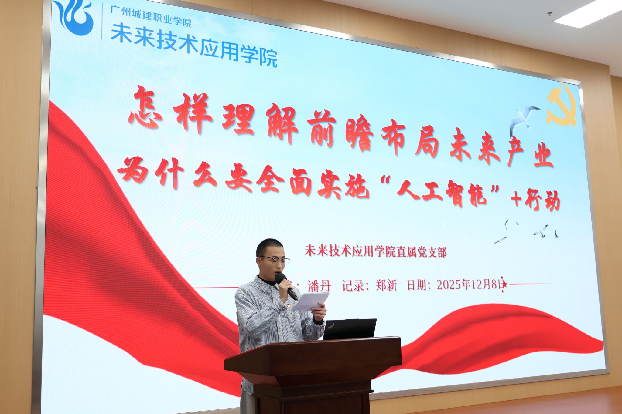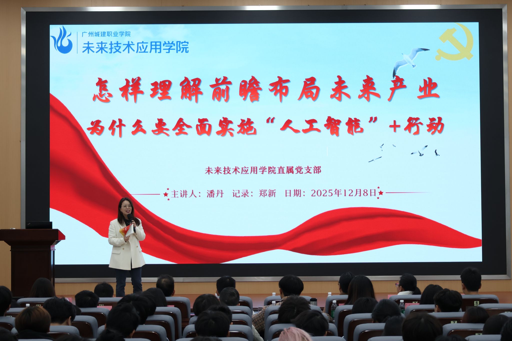 为帮助同学们学习党的二十届四中全会精神,理解其中的核心要义,引导大家坚定理想信念,激发政治热情,读懂国家发展蓝图,指引青春的发展方向。公司党建办公室于12月8日晚,在图书馆414报告厅开展“怎样理解前瞻布局未来产业”与“为什么要全面实施‘人工智能+’行动”主题教育课。参与此次主题教育课的有williamhill直属党支部书记潘丹、副书记王立永、副经理郑永芹、公司全体党员教师以及员工代表。此次主题教育课由郑新主持。