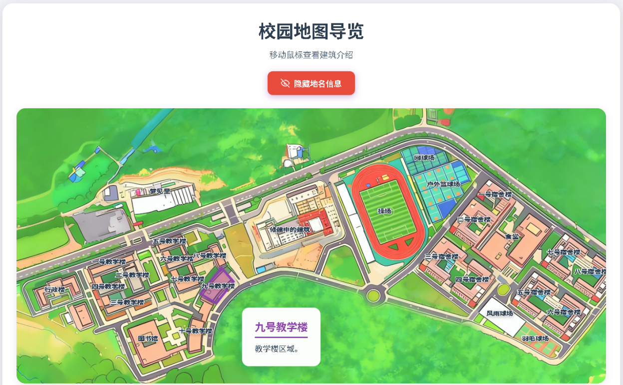 作品亮点:旨在通过Web技术将平面的校园地图“活”起来。不仅仅是一张指路的图片,更是一个信息聚合的窗口。用户可以像探索游戏一样,探索校园的每一个角落——从教学楼到操场,从食堂到宿舍。通过交互式的引导,帮助新生快速熟悉环境,帮助访客了解校园布局,体现校园信息化建设的便捷与智能。
