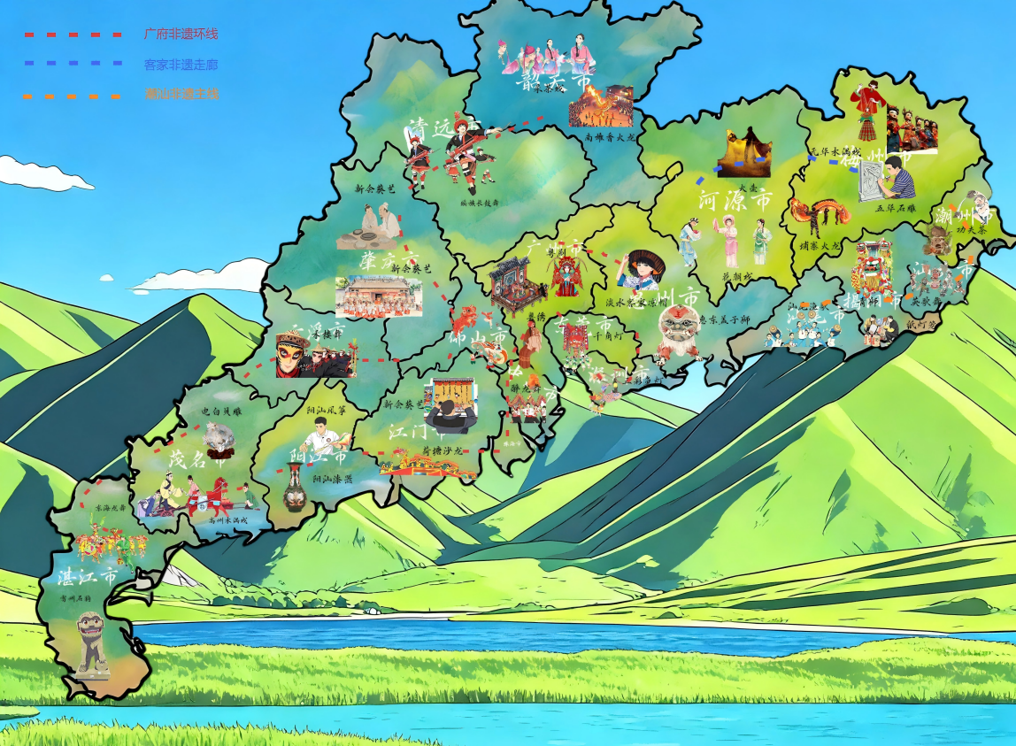 作品亮点:本地图以“传承岭南文脉,探寻非遗之美”为核心,结合地理空间信息与广东非遗文化,通过路线呈现广府、潮汕、客家三大民系的非遗特色,让观者直观感受广东非遗的地域分布与文化脉络。