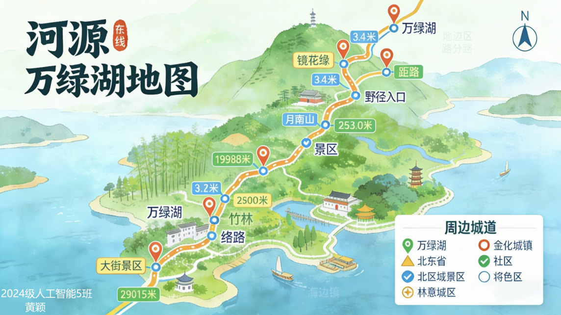 作品亮点:本作品以广东省河源市著名生态旅游区——万绿湖为核心,围绕“山水共生·绿意导航”主题展开设计。地图旨在通过清晰直观的空间表达,突出万绿湖的自然景观结构与人文游览动线,同时强化地域生态特色与旅游服务功能的结合。设计中注重体现湖区的绿色可持续发展理念,以层次分明的色彩与符号系统,引导读者在读图过程中感受“湖在城中、城在绿中”的和谐画面。