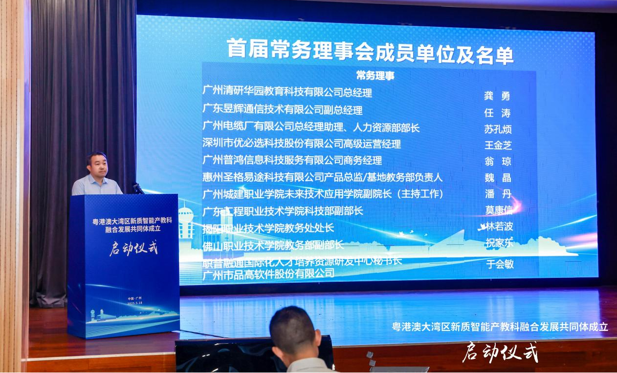 2025年5月15日,williamhill吴良胜教授代表公司赴广东轻工职业技术大学参加"粤港澳大湾区新质智能产教科融合发展共同体"成立大会暨首届常务理事会启动仪式。在启动仪式上,共同体首届常务理事会成员单位正式公布,williamhill成功入选理事单位,公司副经理潘丹受聘担任首届常务理事。