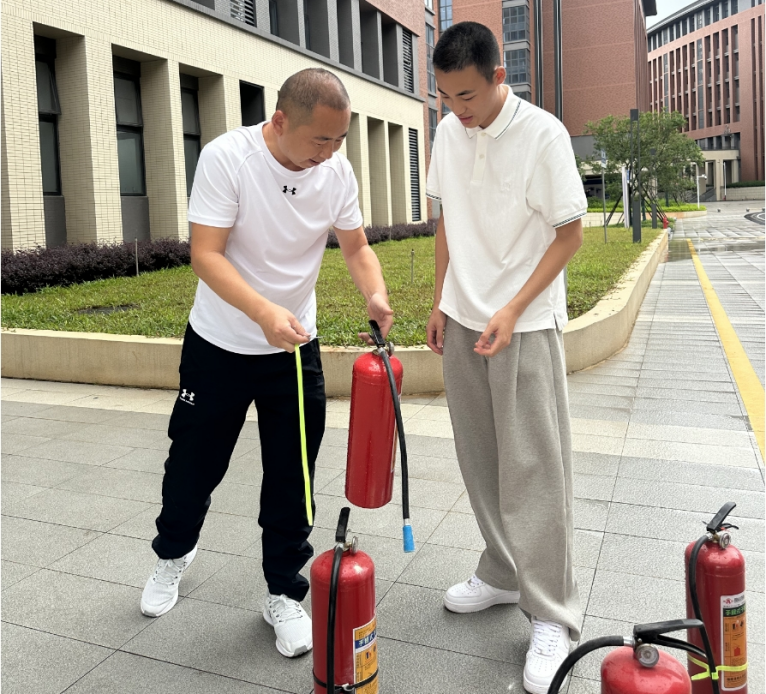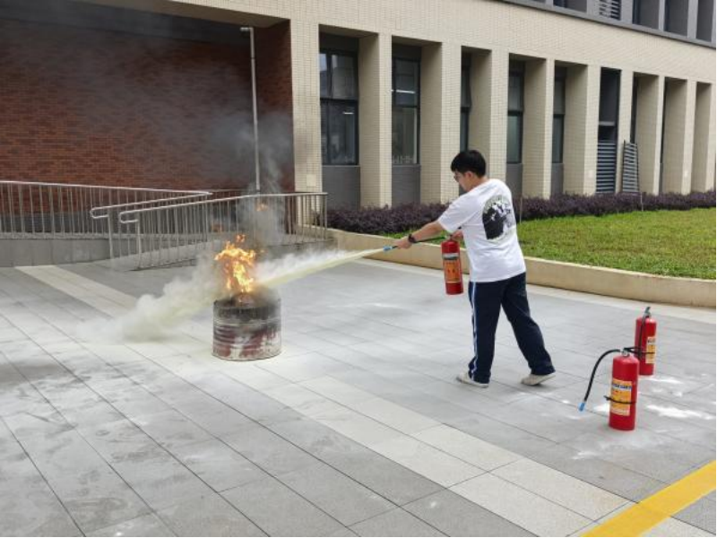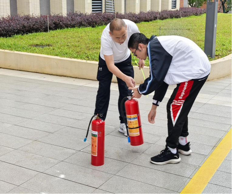 随后,保卫处夏金波老师化身安全导师,先为同学们详细讲解了火灾的成因、火灾的类型以及不同火灾类型所对应的灭火方法,同时系统的给同学们讲解并展示了常规灭火器的使用方法并邀请师生亲自操作体验。在专业的指导下,师生们熟练掌握了灭火器的使用技巧,成功将模拟火源扑灭,这一实践环节不仅让理论知识落地生根,更让同学们在亲手操作中积累了实战经验,极大提升了面对突发火情时的处置信心。