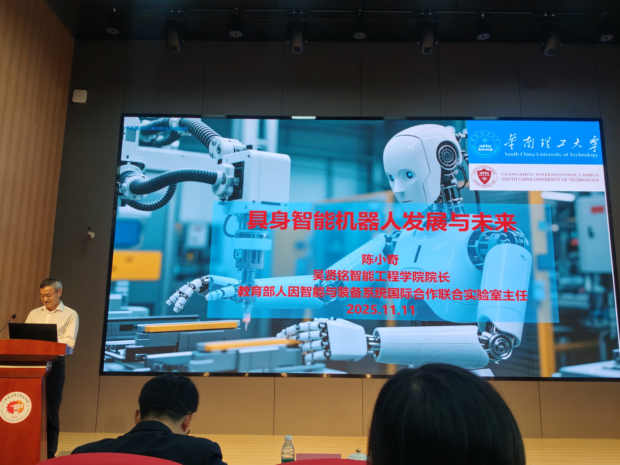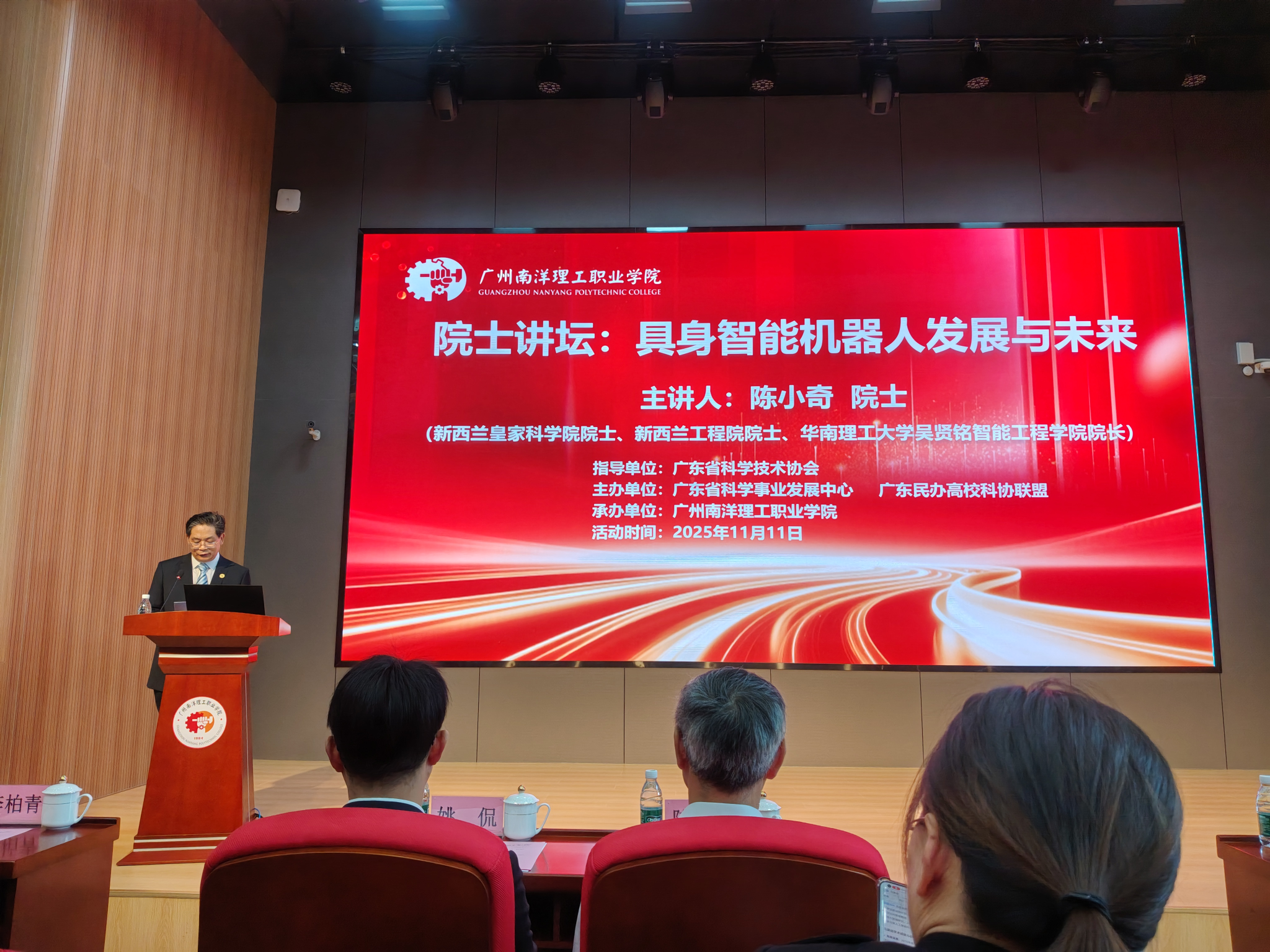 在省科协的领导和支持下,广东民办高校科协联盟于2025年11月11日举办“院士讲坛”,该论坛由新西兰皇家科公司院士、新西兰工程院院士、华南理工大学吴贤铭智能工程公司经理陈小奇先生作《具神智能机器人》专题报告。