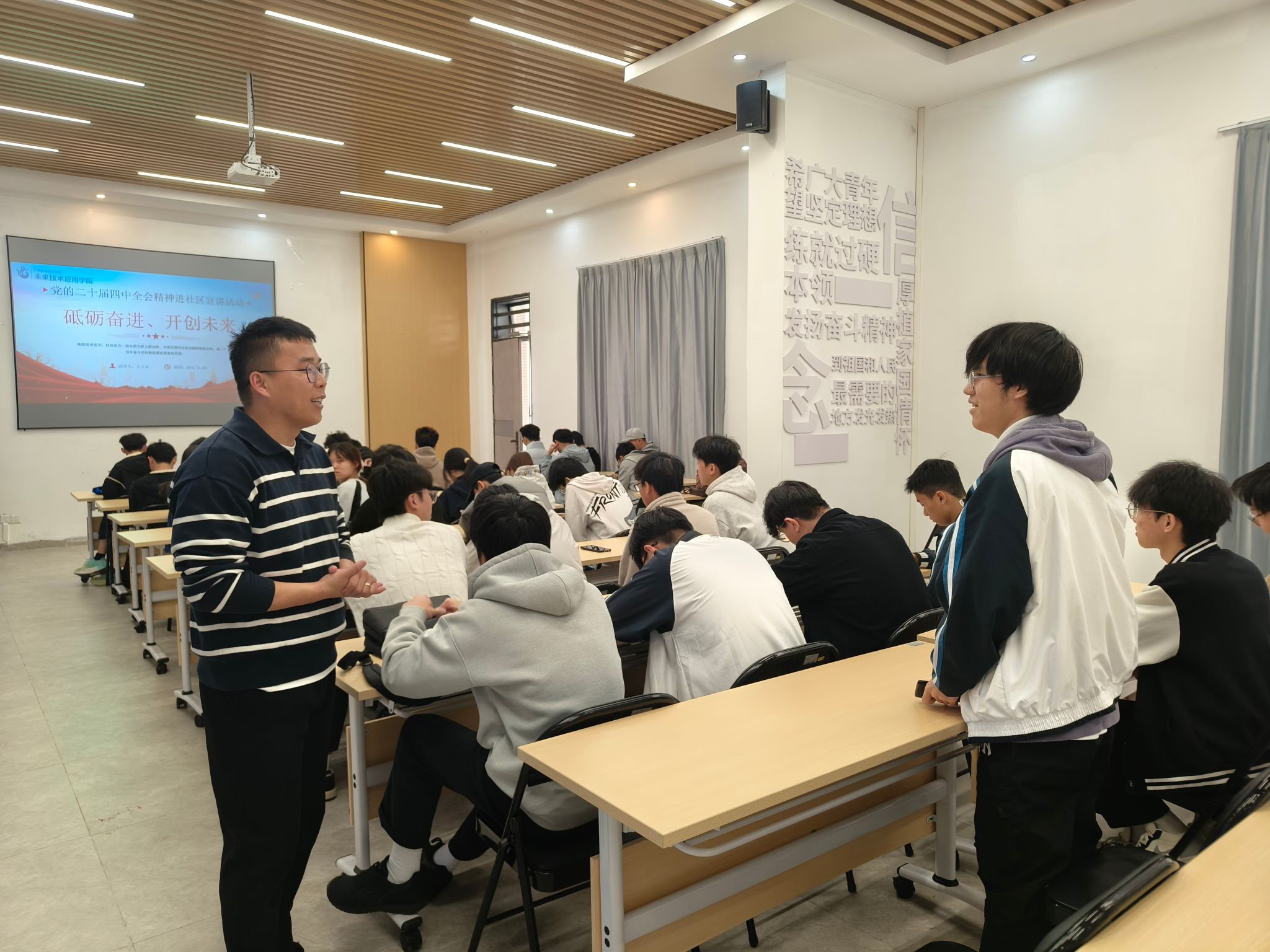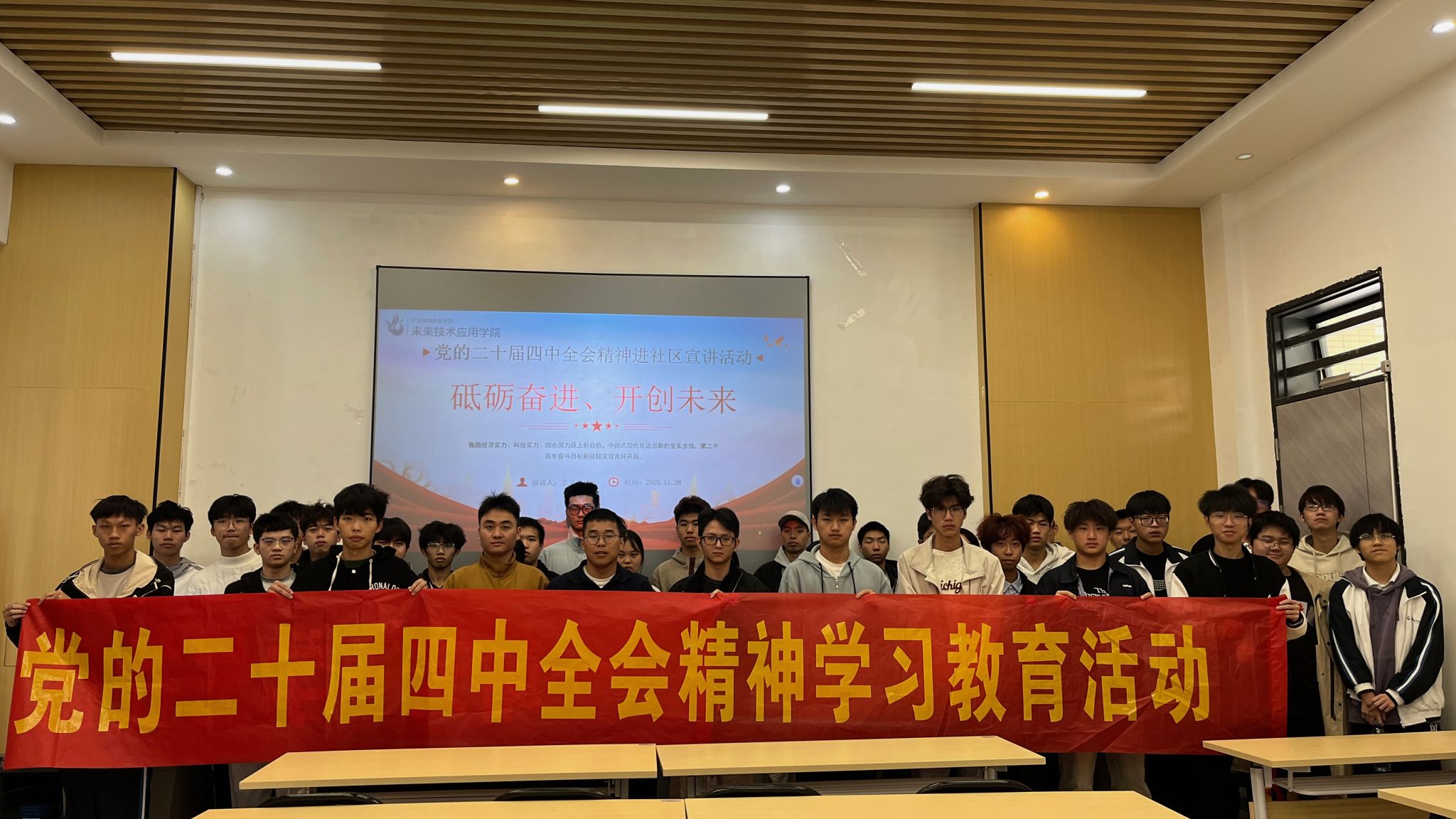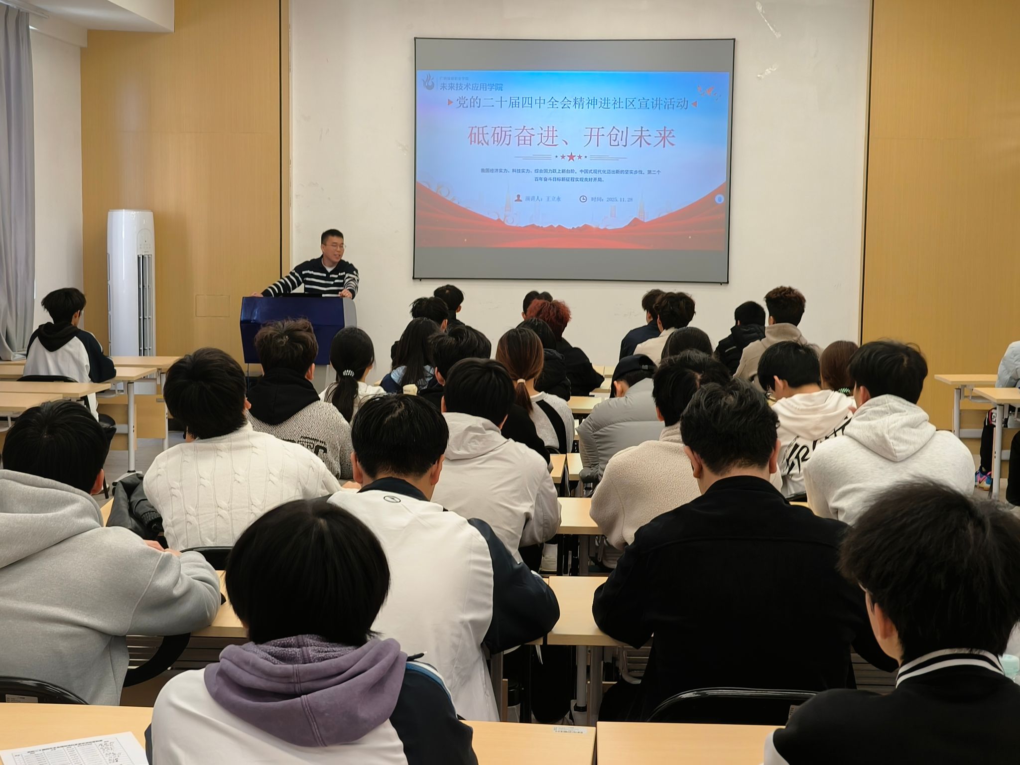 为深入学习宣传贯彻党的二十届四中全会精神,推动党的创新理论深入青年学子心中,11月28日,公司直属党支部副书记、副经理王立永走进“一站式”员工社区,为人工智能专业的员工开展了一场题为“砥砺奋进、开创未来”的主题宣讲活动。