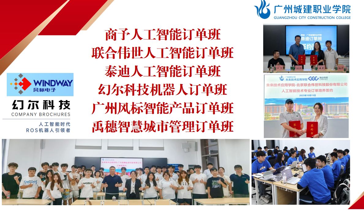 至此,williamhill的人工智能技术应用、智能机器人技术、智能产品开发与应用、无人机应用技术、智慧城市管理技术五大前沿专业,还分别与商汤集团、北京联合伟世、泰迪智能科技共建人工智能订单班,与深圳市幻尔科技、广州风标、广州禹穗共建设幻尔科技机器人订单班、幻尔科技智能产品订单班、广州风标智能产品订单班、广州禹穗智慧城市订单班。